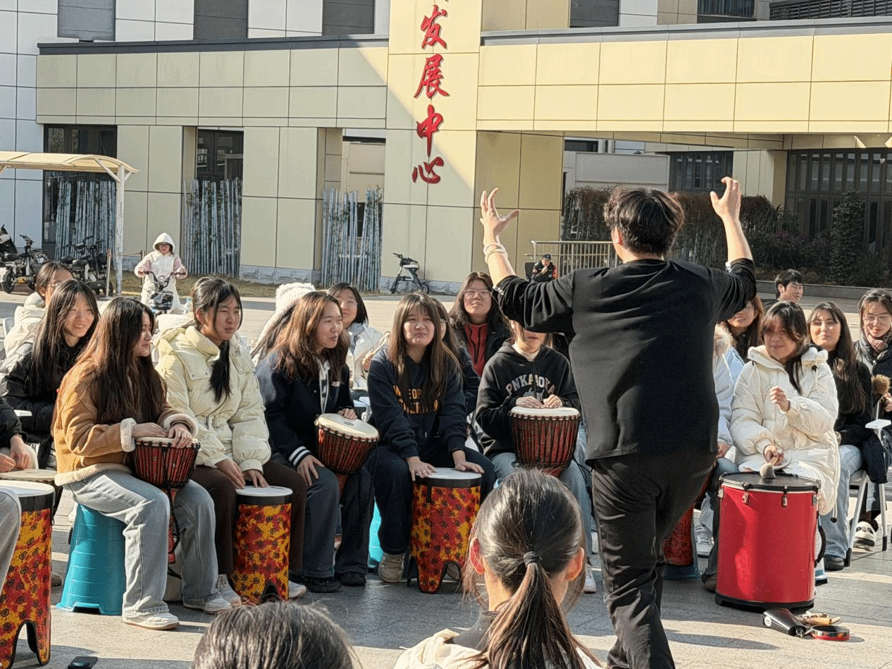在专业引导师的带领下,同学们围坐成圈,手持非洲鼓、手鼓、沙锤等打击乐器,从简单的节奏模仿起步,逐步过渡到自由表达与多声部合奏。引导师巧妙运用节奏变化、强弱交替及互动呼应等技巧,充分激发参与热情。起初略显拘谨的鼓点,很快融合为充满活力与韵律的和谐乐章。激昂的节奏、欢快的旋律,与同学们专注投入的神情、舒展放松的笑容相映成辉,现场洋溢着热烈而温暖的氛围。