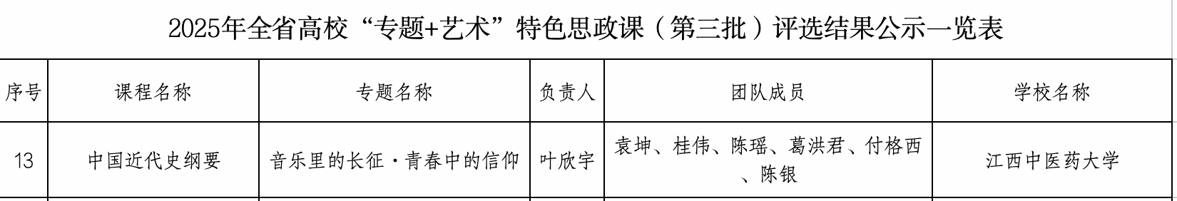 近日,江西省教育厅发布了《关于公布全省 “大思政课” 建设综合改革试验区改革项目评选结果的通知》。由我院叶欣宇老师主持的“音乐里的长征·青春中的信仰”获批全省“专题+艺术”特色思政课。此项目是我院在此领域取得的又一重要突破,实现了我校在该项目上“三连冠”的佳绩。